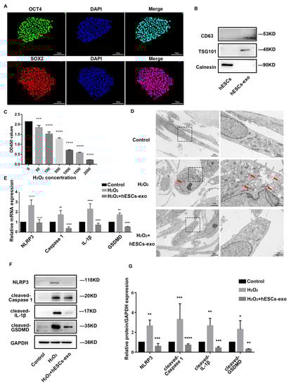 hESCs-exo attenuate pyroptosis of NPCs treated with H2O2. (A). IF staining analysis of pluripotency-related markers SOX2 and OCT4 of hESCs, n = 3. (B). WB showed the presence of exosomes markers, including CD63 and TSG101, but not the negative marker calnexin, n = 3. (C). Viability of NPCs cultured with 0–2000 μM H2O2 for 24 h was evaluated using CCK-8. The data are shown as the means ± SD, n = 5. Compared to the control group; *** p < 0.001, **** p < 0.0001. (D). Representative TEM images of NPCs of control and treatment groups of H2O2 and H2O2 + hESCs-exo. The red arrow shows the characterization of pyroptosis of NPCs. Scale bar: 5 μm and 2 μm, n = 3. (E). Quantitative real-time polymerase chain reaction (qRT-PCR) was used to evaluate the expressions of NLRP3, caspase 1, IL-1β, and GSDMD in NPCs after corresponding treatments. The data are shown as the means ± SD, n = 3. (F,G). WB analysis of NLRP3, cleaved-caspase 1, cleaved-IL-1β, and cleaved-GSDMD in NPCs after corresponding treatments. The data are shown as the means ± SD, n = 3. The H2O2 group compared to the control group, the H2O2 + hESCs-exo group compared to the H2O2 group; * p < 0.05, ** p < 0.01, *** p < 0.001. **** p < 0.0001.