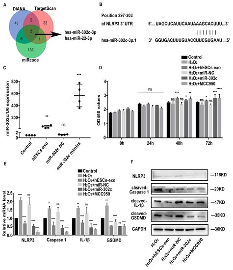 A Venn diagram shows the prediction results of the NLRP3 target microRNAs (miRNAs) in DIANA, miRcode, and TargetScan (Figure 3A). We performed a TargetScan software analysis and identified one potential binding site for miR-302c in the NLRP3 3′ untranslated region (UTR) at 296bp–303bp (Figure 3B). Many studies have shown that the miR-302 family is abundant in hESCs-exo [,]. According to Figure 3C, the miR-302c level was lower in the NPCs but increased following hESCs-exo treatment. To further study the effect of miR-302c on alleviating the pyroptosis of NPCs, a synthetic miR-302c mimic (50 nM) was transfected into the NPCs, and the transfection effect was verified using miRNA-specific quantitative real-time polymerase chain reaction (qRT-PCR) (Figure 3C). Meanwhile, MCC950, a potent, selective, and common small-molecule inhibitor of NLRP3, was used to treat the NPCs as a positive control. A CCK-8 assay showed that the increase in cell viability was amplified over time in the NPCs treated with hESCs-exo, miR-302c mimics, or MCC950, especially at 72 h (Figure 3D). The mRNA and protein expression levels of NLRP3, caspase 1, IL-1β, and GSDMD in the NPCs were significantly decreased after hESCs-exo treatment or the overexpression of miR-302c (Figure 3E,F). These results suggest that hESCs-exo could suppress NLRP3 inflammasome activation in NPCs by delivering miR-302c.