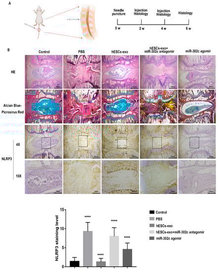 hESCs-exo-derived miR302c could retard IVDD in a rat model. (A). Image of the construction of a disc degeneration model created with BioRender.com. (B). Images of HE, Alcian blue/Picrosirius red staining, IHC staining of NLRP3, and qualification analysis in the different groups are shown. The data are shown as the means ± SD, n = 3. The PBS group compared to the control group, the hESCs-exo group compared to the PBS group, the hESCs-exo + miR-302c antagomir group compared to the hESCs-exo group, the miR-302c agomir group compared to the PBS group. **** p < 0.0001.