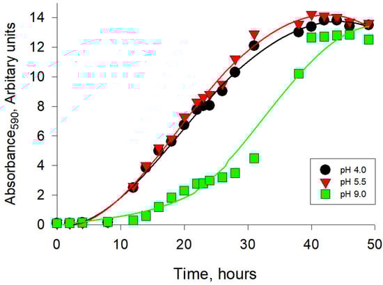 Previously, we have shown that the optimum pH for the growth of the Y. lipolytica yeast is within usual yeast optimal pH interval of 4.5–6.0 []. The growth in the pH range from 3.5 to 4.5 showed a smooth rise on the curve, a slight jump at pH of 5.0, and a gradual decrease in growth features at pH of 10.5–11.0. The shift in growing conditions towards alkaline pH values (pH ≥ 7.5) in relation to the optimal pH led to a more than 4-fold decrease in the value of the calculated biomass doubling rate (μ). However, a long stage of logarithmic growth of the culture made it possible to increase the volume of cell mass, comparable with the accumulation of biomass under optimal conditions for the strain. This gives grounds to classify the Y. lipolytica W29 strain studied by us as a moderate alkalotolerant []. At the same time, the range typical for most yeasts, 5.5–6.0, can be considered optimal for the growth of Y. lipolytica. The drop in biomass accumulation was 20% and 60% when the yeast was cultivated at pH 4.0 and 9.0, respectively. The plot of absorbance of the Y. lipolytica cell suspension versus culture pH presented in Figure 1 shows the overall pattern of long-term yeast growth to the stationary phase and demonstrates that pH variations significantly affect the length of the lag-period and the exponential phase of yeast growth. Thus, at pH 4.0 and 5.5, the duration of the lag period was less than 8 h, while at pH 9.0 it was about 13 h. In addition, we observed a slowdown in the culture growth rate at pH 9.0, which manifested itself in the appearance of an extended logarithmic phase (Figure 1). The onset of the stationary phase of growth at alkaline pH occurred 10 h later than at pH 4.0 and 5.5. An analysis of the growth characteristics testified to the development of a stress effect on cells at extreme pH of the medium, which was especially pronounced at alkaline values.