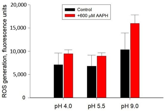 Fluorescence intensity (units), reflecting total ROS generation, 60 min after cell suspension staining with Y. lipolytica W29 H2DCF-DA at various pH values. Cells exposed to pro-oxidant 600 μM 2,2′-azobis(2-methylpropionamidine) dihydrochloride (AAPH) were used as a positive control. The incubation medium for the experiments contained 50 mM KPi, pH 5.5; and 1% glucose. Values are mean ± standard deviation from 5–6 independent experiments. No statistically significant differences compared to the corresponding control.