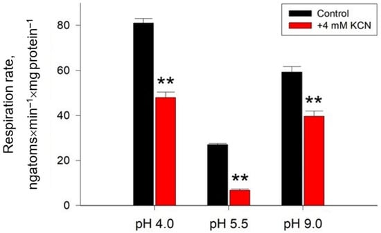 The level of free radical generation is directly related to the aerobic metabolic activity of cells, the main parameter of which is cellular respiration. The total oxygen consumption by cells of a number of eukaryotes (yeast, fungi, and plants) is contributed to by two main blocks of enzyme complexes responsible for electron transfer in the inner mitochondrial membrane: the main (cytochrome pathway) and the alternative (cyanide-resistant pathway) oxidases []. The contribution of alternative oxidase to the overall rate of cellular respiration can be regarded as one of the markers of oxidative stress, since it is known that ROS cause peroxidation of cardiolipin, which is necessary for the functioning of cytochrome oxidase. A similar state is achieved when cells are treated with KCN. Thus, the cell is forced to switch to an alternative oxidation pathway [].