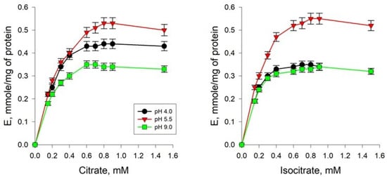 Dependence of the rate of the enzymatic reaction on the concentration of the substrates of citrate and isocitrate, determined for AH isolated from the Y. lipolytica cells grown at pH of 4.0, 5.5, and 9.0. Values are mean ± standard deviation from 5–6 independent experiments.