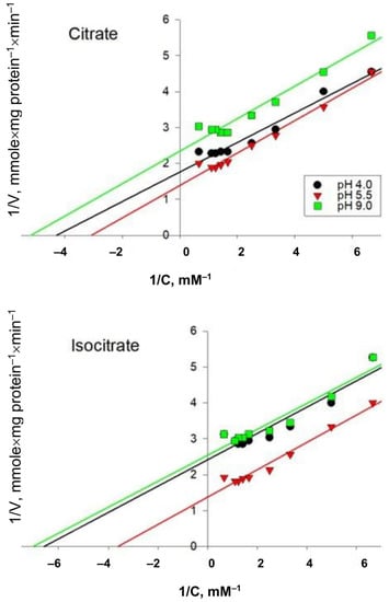 The Michaelis–Menten constants for citrate and isocitrate for the enzyme from the Y. lipolytica cells cultured at different pH were calculated using double inverse Linewiver-Burke coordinates (Figure 5). As can be seen from Figure 5, for different pH values, the Lineweaver–Burk trend lines are parallel to each other and to the control conditions, but the points of intersection with the y-axis are above zero.