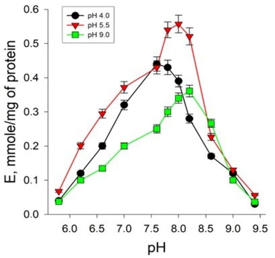 The study of the dependence of the rate of the AH reaction on the concentration of hydrogen ions showed that both under normal and under extreme conditions of cultivation, the enzyme was active in the pH range from 6.0 to 9.0. The pH optimum for AH from Y. lipolytica cells grown under normal conditions was 8.0. The cultivation of yeast cells in extremely acidic conditions of the nutrient medium was accompanied by a decrease in the optimum pH for AH to 7.6. However, when growing yeast under conditions of extremely high concentrations of hydrogen ions in the medium, a statistically insignificant increase in the optimum pH of AH to 8.2 was observed compared to normal cultivation conditions (Figure 6).