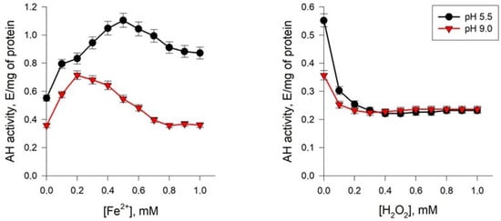 AHs are known to be the main targets of the reactive oxygen (ROS) and nitrogen (RNS) species, which can oxidize the iron–sulfur cluster of the enzyme. It leads to the release of iron and, as a consequence, to the loss of the AH catalytic activity []. Therefore, we assayed the dynamics of the AH activity depending on the action of peroxide radicals at different concentrations. We have shown that H2O2 reduced the AH activity (Figure 7). The enzyme from the yeast cells cultured under normal conditions proved more sensitive to the inhibitory effect of peroxide (Figure 7). Thus, H2O2 at a concentration of 0.2 mM decreased the enzyme activity by more than 50% in the culture grown at pH of 5.5 and decreased it by 35% in the yeast cultivated at pH 9.0 (Figure 7). Upon a further increase in the metabolite-regulator level up to 1 mM, the inhibitory effect persisted.