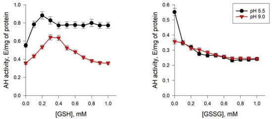 The activity of the enzyme from the yeast cells grown at pH 9.0 and 5.5 increased when the level of the reduced glutathione rose up to 0.3 and 0.2 mM, respectively. At higher concentrations, the degree of the inducing effect decreased (Figure 8). So, a more significant increase in the AH activity was detected for the enzyme from the cells cultured at pH of 5.5. The oxidized glutathione inhibited AH activity from the cells of all of the groups tested, affecting more strongly the enzyme isolated from the culture grown at pH 5.5. Thus, at a concentration of the oxidized glutathione of 0.2 mM, the enzyme activity decreased by more than 40% when the population was cultivated at pH 5.5 and by 12% when it was cultivated at pH 9.0 (Figure 8). A further increase in the metabolite level up to 1 mM facilitated the inhibitory effect for both cultures.