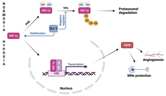 DJ-1-mediated protection against hypoxia. Under normoxia conditions, HIF-1α is constantly hydroxylated, ubiquitinated, and degraded at the proteasome. Under hypoxic conditions, HIF-1α translocates into the nucleus, where it promotes the expression of numerous genes involved in hypoxic adaptation. Among them, the VEGF protein stimulates vessel growth and promotes the survival of motor neurons during hypoxia. DJ-1 has been proposed to act as a negative regulator of VHL stabilizing the transcription factor HIF-1α. Acronyms are mentioned in the main text. (Created with BioRender.com, accessed on 6 April 2023.)