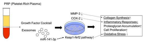 - Xu, J.; Xie, G.; Yang, W.; Wang, W.; Zuo, Z.; Wang, W. Platelet-Rich Plasma Attenuates Intervertebral Disc Degeneration via Delivering Mir-141-3p-Containing Exosomes. Cell Cycle 2021, 20, 1487–1499. [Google Scholar] [CrossRef] [PubMed]