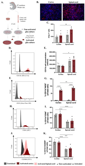 This study compared microglial activation, phagocytosis, and morphology in cultures obtained from cortex or spinal cord tissues. To perform an accurate comparison, we isolated the cells from these two regions (cortex and spinal cord) from the same P7 Wistar rat and followed the same protocol (Figure 1A, Figure 2A and Figure 3A). This procedure controls for confounding factors, such as species, sex, genetic background, and age.