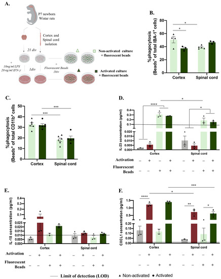 As previously mentioned, microglia significantly contribute to central nervous system function by clearing apoptotic and cell debris through phagocytosis during development, homeostasis, and disease paradigms [21]. We followed the same experimental design to analyze how microglial function is altered in vitro according to the region of origin (Figure 2A). After establishing the glial culture, we incubated the cells with GFP fluorescent microspheres and evaluated the phagocytosis rate and cytokine production in non-activated and activated microglia (Figure 2A). Surprisingly, this process was revealed to be dynamic between non-activated and activated conditions, revealing a significant effect of factor interaction (CNS origin and activation) (Figure 2B, F(1,11) = 12.72, p = 0.0044). Under basal conditions, microglia derived from the spinal cord presented less phagocytosis than microglia isolated from the cortex (Figure 2B spinal cord: 39.05%, ±1.089 compared to cortex: 50.46%, ±4.767 p = 0.0428). Conversely, after activation, the spinal cord microglia showed an increased phagocytosis function (to 46.58%, ±1.369) compared to the cortex microglia phagocytosis rate, which was significantly decreased (to 37.33%, ±1.963 p = 0.0406) (Figure 2B). We also evaluated microglial phagocytosis by flow cytometry, which allowed us to analyze the presence of engulfed beads, specifically in the microglia, through the previous gating of this population (Supplementary Figure S1C). This quantification again showed an effect of the CNS origin on microglial phagocytosis function (Figure 2C, F(1,19) = 62.22, p < 0.0001), where, in accordance with the immunocytochemistry data, spinal-cord-derived microglia in the basal state (Figure 2C, spinal cord: 18.25 ± 1.637) had a lower phagocytosis rate (compared to cortex: 32.75 ± 1.670) (Figure 2B,C). However, in the activated glial cultures, spinal cord microglia phagocytosis (Figure 2C, spinal cord: 19.70 ± 2.143) was significantly lower than cortex microglia phagocytosis (Figure 2C, cortex: 32.02 ± 1.389), p = 0.0004). The supernatants of these cultures were used to characterize the cytokine panel released before and after incubation with the fluorescent beads (Figure 2D–F). Curiously, the production of IL-23 was influenced by incubation with the fluorescent beads, with the IL-23 levels were below the limit of detection (LOD) before incubation and highly increased after bead incubation (Figure 2D, F(1,15) = 160.2, p < 0.0001). Moreover, the cortex-derived glia produced more IL-23 when incubated with fluorescent beads under basal conditions (Figure 2D cortex:0.2789 ± 0.004995) than the spinal-cord-derived glia (Figure 2D, spinal cord: 0.1850 ± 0.04937, Figure 2D, F(1,15) = 11.97, p = 0.0035), which, in addition to being a tendency, was maintained after the activation protocol (Figure 2D, p = 0.0629). IL-18 was produced in slightly higher amounts after activation; however, no statistically significant difference was observed between the groups (Figure 2E). The CXCL1 cytokine followed the same profile, being produced in high amounts after the activation protocol for both the cortex- and spinal-cord-derived cultures, independent of fluorescent bead incubation (Figure 2F, F(1,15) = 212.8, p < 0.0001). Moreover, in the activated cultures, a CNS origin effect was noted, with the cortex-derived cells being greater producers of CXCL1 than the spinal-cord-derived cells (Figure 2F, cortex: 1.390 ± 0.05250 vs. spinal cord: 0.6206 ± 0.1359, Figure 2F, F(1,15) = 31.80, p < 0.0001).