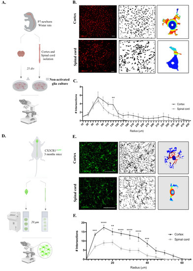 Since microglial morphology has been related to the cell functional state, this parameter was also analyzed by comparing the cortical and spinal cord microglia on both the in vitro and in vivo levels. The morphology was analyzed using the Sholl analysis plugin of the Fiji software from Fiji (RRID:SCR_002285) [67].