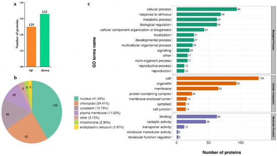 The analysis of differentially modified proteins (DMPs) was performed under low and control N conditions, and the results are shown in Figure 2a. DMPs were selected by p-value and fold change (FC) with thresholds of FC > 1.5 and a p-value < 0.05. Compared to control N conditions, 258 proteins were differentially modified under low N conditions, with 123 up-regulated and 133 down-regulated. The results of subcellular structure location classification analysis are shown in Figure 2b. The subcellular structure of DMPs is divided into seven categories, among which ‘Nucleus’, ‘Chloroplast’, and ‘Cytoplasm’ were more numerous. All the identified significant changed phosphoproteins (258) were used for GO annotation. The distribution pie charts for biological process, cellular component, and molecular function are shown in Figure 2c. Within biological process, the enriched GO terms were ‘cellular processes, ‘response to stimulus’, and ‘metabolic processes’. Within cellular component, the enriched GO terms were ‘cell’, ‘organelle’, and ‘membrane’. Within molecular function, the enriched GO terms were ‘binding’, ‘catalytic activity’, and ‘transporter activity’.