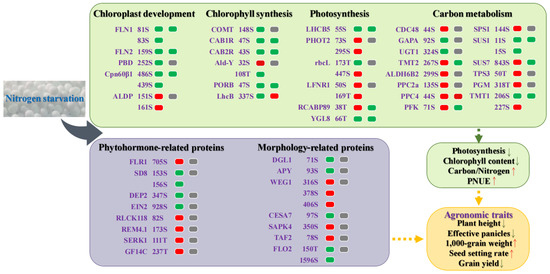 A summary of differences in morphysiology and phosphoproteomics in response to nitrogen starvation in rice. The red squares indicate up-regulation, the green squares indicate down-regulation, and the gray squares indicate no significant difference. The first column is protein phosphorylation data and the second column is qRT-PCR data. qRT-PCR data were standardized using OsACTIN1 as an internal reference, and data are presented as means (n = 3). The up arrows indicate increases and the down arrows indicate decreases under low nitrogen conditions.