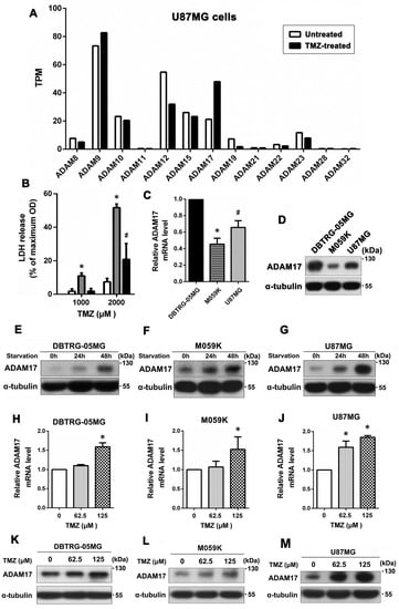 ADAM17 expression was induced under serum deprivation and TMZ treatment, which was related to TMZ resistance in GBM cell lines. (A) U87MG cells were treated or not with TMZ, and the relative gene expression levels (TPM) of 13 different ADAMs were measured using RNA sequencing data. (B) Three GBM cell lines were treated with 1000 or 2000 μM TMZ for 24 h, and cell death was evaluated using an LDH-based cytotoxicity assay. (C,D) Transcript and protein expression levels of ADAM17 in the three GBM cell lines were evaluated using q-PCR and Western blotting, respectively. * p < 0.05, compared with DBTRG-05MG and U87MG, # p < 0.05, compared with DBTRG-05MG and M059K. (E–G) Cells were cultured in a serum-withdrawal medium for 24 and 48 h, and ADAM17 expression in three GBM cell lines was analyzed by Western blotting. (H–J) Cells were treated with increasing doses of TMZ (0–125 μM) for 48 h, and the transcript expression of ADAM17 in the three GBM cell lines was quantitated using qPCR. * p < 0.05, compared with untreated controls. (K–M) Effect of TMZ on ADAM17 protein levels in GBM cells was analyzed using Western blotting.
