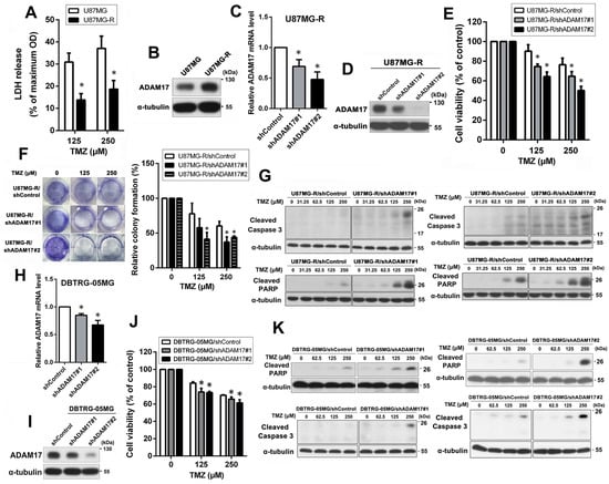 ADAM17 knockdown promoted the sensitivity of GBM cells to TMZ. (A) U87MG and U87MG-R cells were exposed to 125 or 250 μM of TMZ for 48 h. Cell death was evaluated using an LDH-based cytotoxicity assay. * p < 0.05, compared with U87MG. (B) ADAM17 protein expression in U87MG and U87MG-R cells was evaluated by Western blotting. (C,D) The efficiency of knockdown was analyzed using qPCR and Western blotting. (E) Cells were exposed to increasing doses of TMZ for 48 h. Subsequently, cytotoxicity was assessed using the MTT assay. * p < 0.05, compared with the shControl group. (F) Effect of ADAM17 knockdown on the TMZ sensitivity of U87MG-R cells was determined using colony formation assay. A representative image (left panel) and quantification (right panel) are shown. * p < 0.05, compared with the shControl group. (G) Cells were exposed to a range of TMZ doses (0–50 μM) for 48 h, and the expression levels of cleaved caspase-3 and cleaved PARP were analyzed using Western blotting. α-Tubulin was utilized as the loading control. (H,I) The efficiency of ADAM17 knockdown in DBTRG-05MG cells was confirmed using qPCR and Western blotting. (J) Cells were exposed to increasing concentrations of TMZ (0–250 μM) for 48 h, and cell viability was evaluated through the MTT assay. * p < 0.05, compared with the shControl group. (K) To evaluate the effect of ADAM17 knockdown on TMZ sensitivity in DBTRG-05MG cells, the levels of cleaved caspase-3 and cleaved PARP were measured using Western blotting. α-Tubulin was utilized as the loading control.