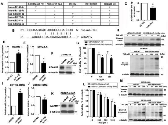 miR-145-5p targets ADAM17 to reduce its protein expression, leading to increased TMZ sensitivity in GBM cells. (A) Five bioinformatic algorithms were used to predict miRNAs that can potentially regulate ADAM17 expression. (B) The predicted target sequence of miR-145-5p in the 3′-UTR of ADAM17. (C) Relative expression levels of miR-145-5p were detected in resistant (U87MG-R) and parental (U87MG) cells using qPCR. * p < 0.05, compared with U87MG cells. (D–H) U87MG-R cells were transiently transfected with miR-145-5p mimics or negative controls (miR-NC), followed by TMZ treatment (0–250 μM) for 48 h. Subsequently, cytotoxicity was evaluated using the MTT assay and Western blotting. The levels of miR-145-5p and ADAM17 were validated using qPCR and Western blotting (D–F). Cell viability was determined using the MTT assay (G). Levels of cleaved PARP and cleaved caspase-3 were detected using Western blotting (H). (I–M) DBTRG-05MG cells were transiently transfected with miR-145-5p mimics or negative controls (miR-NC), followed by TMZ treatment (0–1000 μM) for 48 h. The effects of miR-145-5p mimic transfection on miR-145-5p and ADAM17 levels were validated using qPCR and Western blotting (I–K). Effects of transient transfection of miR-145-5p mimics on TMZ sensitivity were assessed using the MTT assay and Western blotting (L,M). α-Tubulin was used as the internal loading control. * p < 0.05, compared to miR-NC.