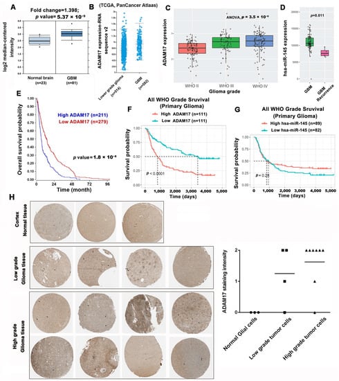 2.4. ADAM17 Expression Is Correlated to GBM Progression and Poor Prognosis