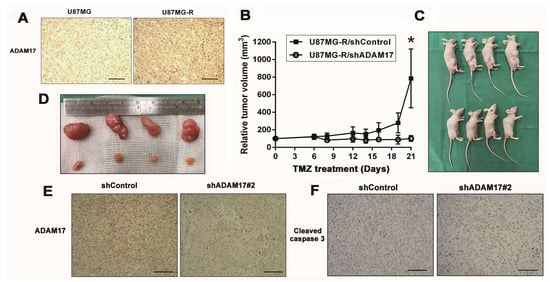 ADAM17 knockdown enhanced TMZ sensitivity of GBM xenograft tumors. (A) Immunohistochemical staining of ADAM17 in xenograft tumors derived from U87MG and U87MG-R cells. (B) Tumor growth curves of U87MG-R/shADAM17 and U87MG-R/shControl xenografts in mice following TMZ administration (n = 4). * p < 0.05, compared with the shControl group. (C) Images of subcutaneously injected xenograft tumors in nude mice at the end of the experiment. (D) Photographs of xenograft tumors from each group captured at the end of the experiment. (E,F) Representative images of IHC staining for ADAM17 and cleaved caspase-3 expression. Scale bar = 100 μm.