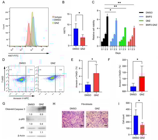 2.1. QNZ Inhibited the Proliferation and Migration of Fibroblasts