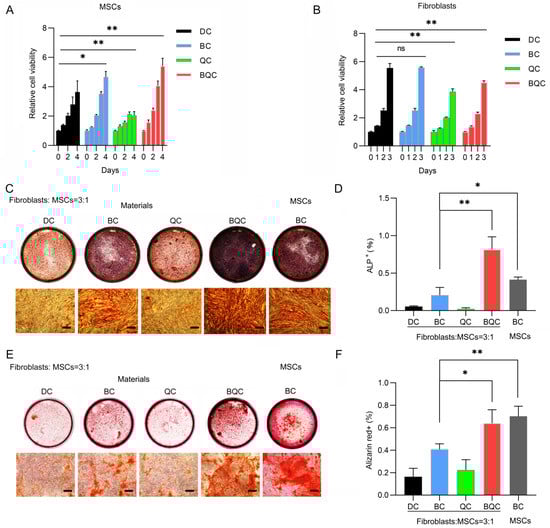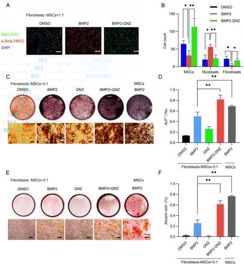 2.3. QNZ Treatment Promoted an Osteogenic Phenotype in MSCs When Co-Cultured with Fibroblasts