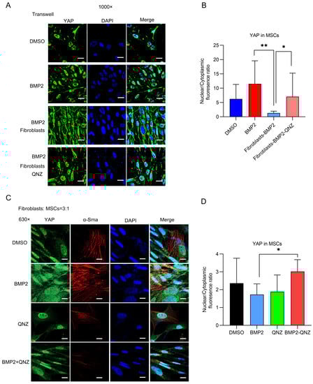 Huang, F.; Wang, H.; Zhang, Y.; Wei, G.; Xie, Y.; Wu, G. Synergistic Effect of QNZ, an Inhibitor of NF-κB Signaling, and Bone Morphogenetic Protein 2 on Osteogenic Differentiation in Mesenchymal Stem Cells through Fibroblast-Induced Yes-Associated Protein Activation. Int. J. Mol. Sci. 2023, 24, 7707. https://doi.org/10.3390/ijms24097707