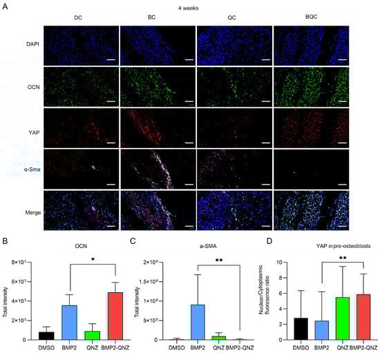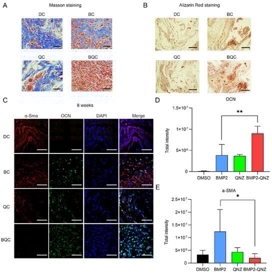 2.5. BMP2/QNZ/Collagen I Biomaterials Enhanced Osteogenesis In Vivo