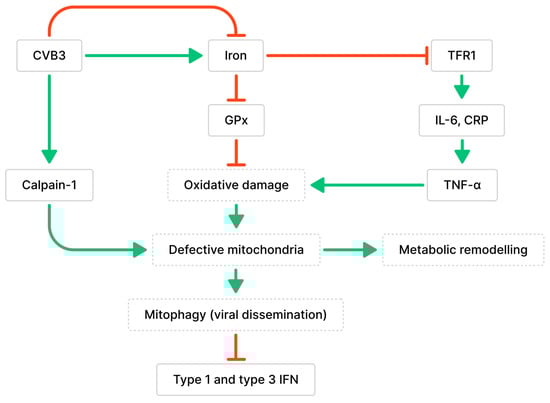 - Oh, S.-J.; Lim, B.-K.; Yun, J.; Shin, O.S. CVB3-Mediated Mitophagy Plays an Important Role in Viral Replication via Abrogation of Interferon Pathways. Front. Cell. Infect. Microbiol. 2021, 11, 704494. [Google Scholar] [CrossRef] [PubMed]