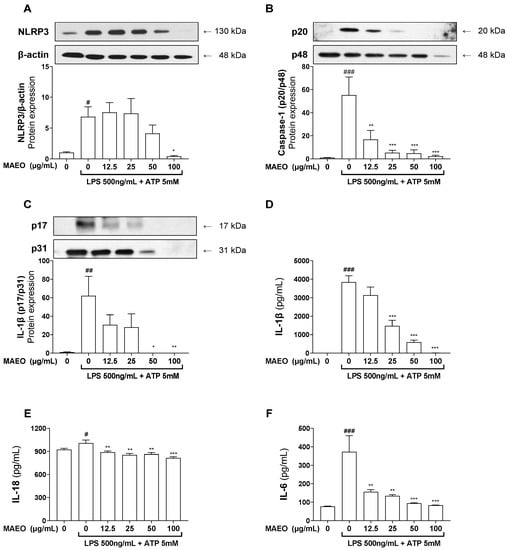 Bone marrow macrophages were isolated, according to Gaire et al. []. Briefly, femurs and tibias of 8-week-old ICR mice were flushed to obtain bone marrow cells. Then, the cells were differentiated into adherent bone marrow-derived macrophages (BMDMs) in minimum essential medium-α (MEM-α) with 10% heat-inactivated fetal bovine serum (FBS), 100 units/mL penicillin-streptomycin (P/S), and 30 ng/mL recombinant mouse macrophage colony-stimulating factor (M-CSF) at 37 °C and 5% CO2. BMDMs were exposed to different concentrations (12.5–100 μg/mL) of MAEO for 1 h before being stimulated with 500 ng/mL lipopolysaccharide (LPS) for 4 h and given an additional stimulation with 50 mM adenosine triphosphate (ATP) for 30 min.