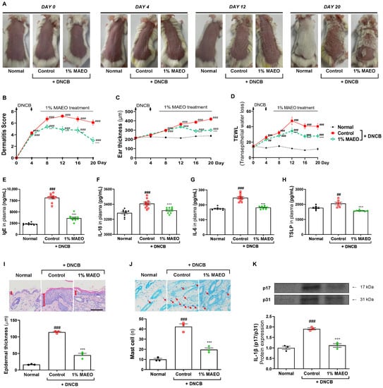 Effects of MAEO on AD-like skin lesions induced by DNCB in BALB/c mice. (A) Representative images of the mice were captured at the same magnification. (B) The severity of dermatitis, (C) thickness of the ear, and (D) TEWL were measured every four days. Two-way ANOVA was used for statistical analysis, and significance was established as ### p < 0.001 versus the control group; *** p < 0.001 versus the control group. (E) IgE, (F) IL-18, (G) IL-6, and (H) TSLP levels were determined in plasma. Images of the dorsal skin stained with H&E and TB were captured at 200× magnification, and the scale bar is 100 μm. (I) Epidermal thickness (red line) and (J) the number of infiltrated mast cells (red arrows) were quantified. (K) The relative protein expression of IL-1β was quantified. One-way ANOVA was used for statistical analysis, and significance was established as ## p < 0.01, ### p < 0.001 versus the normal group; *** p < 0.001 versus the control group.