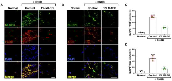 Macrophages, the main cell type mediating the NLRP3 inflammasome response, can massively migrate to skin with AD lesions. Therefore, we identified that MAEO has the potential to obstruct inflammasome formation and NLRP3 expression in macrophages found in AD lesions (Figure 3A,B). The DNCB-induced AD model demonstrated a notable increase in the count of cells positive for NLRP3 and F4/80, whereas administration of 1% MAEO significantly attenuated NLRP3-expressing macrophages (Figure 3C). In addition, we observed an increase in double-stained cells positive for NLRP3 and ASC in the dorsal skin of DNCB-induced AD-like mice. As expected, the group treated with 1% MAEO exhibited a statistically significant reduction in the number of cells positive for both NLRP3 and ASC (Figure 3D). These findings indicate that MAEO can effectively regulate both the infiltration of NLRP3-overexpressing macrophages and formation of the NLRP3 inflammasome in DNCB-induced AD lesions.