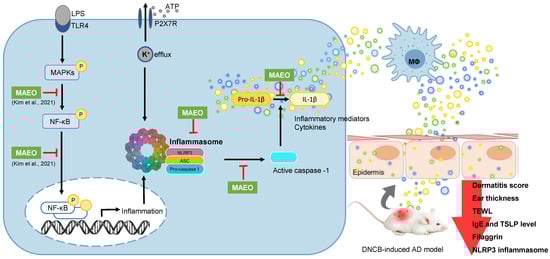 Proposed mechanism for the action of MAEO on the NLRP3 inflammasome under inflammatory conditions induced by LPS + ATP and AD-like conditions induced by DNCB. The mechanism of action of MAEO for MAPK/NF-κB inhibition was reported in our previous study [].