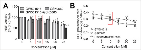 2.1. PPARδ Agonist GW501516 and PPARδ Antagonist GSK0660 Administered Separately or in Combination Inhibit the Proliferation and Viability of HBFs in a Dose-Dependent Manner