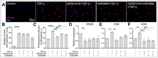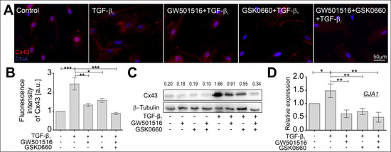 2.3. The TGF-β-Induced Upregulation of Cx43 Is Strongly Suppressed in HBFs Treated with GW501516 and GSK0660 Alone or in Combination via Smad-Dependent Signaling