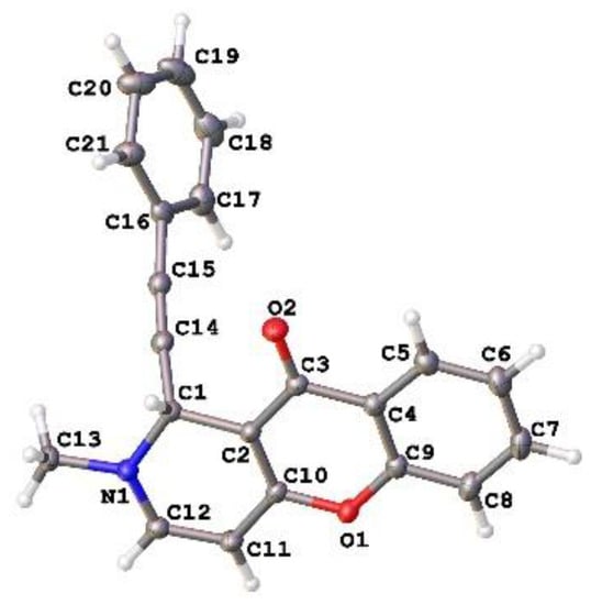 2-Methyl-1-(phenylethinyl)-1H-chromeno[3,2-c]pyridine-10(2H)-one (3a). Yield 44%, yellow crystals, m.p. = 140–141 °C. 1H NMR (600 MHz, CDCl3) δ (ppm): 3.19 (s, 3H), 5.11 (d, J = 7.3 Hz, 1H), 5.94 (d, J = 1.2 Hz, 1H), 6.62 (dd, J = 7.3, 1.3 Hz, 1H), 7.22–7.26 (m, 3H), 7.29–7.36 (m, 2H), 7.37–7.42 (m, 2H), 7.55 (ddd, J = 8.7, 7.1, 1.7 Hz, 1H), 8.19 (dd, J = 7.9, 1.6 Hz, 1H). IR spectra (KBr), cm−1: 2250.8 (-C≡C-). HRMS (MALDI+) m/z calcd for C21H15NO2 in form of [M + H]+ ion 314.1181, found: 314.1195. Crystals suitable for X-ray crystallography were obtained by slow crystallization of a solution in methanol.