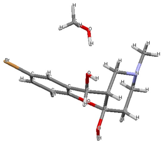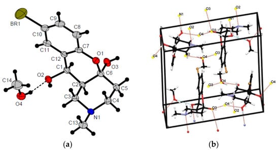 (4aR*,10S*,10aR*)-8-Bromo-2-methyl-1,2,3,4,10,10a-hexahydro-4aH-chromeno[3,2-c]pyridine-4a,10-diol (7c). White crystals, yield 86%, m.p. = 160–161 °C. 1H NMR (600 MHz, DMSO-d6) δ (ppm): 1.77–1.86 (m, 2H), 1.88–1.92 (m, 1H), 1.93–1.96 (m, 1H), 2.13–2.16 (m, 1H), 2.22 (s, 3H), 2.68–2.73 (m, 1H), 2.99 (ddd, J = 10.6, 4.1, 1.6 Hz, 1H), 4.33 (dd, J = 10.9, 7.9 Hz, 1H), 5.41 (d, J = 8.1 Hz, 1H), 6.47 (d, J = 1.7 Hz, 1H), 6.69 (d, J = 8.6 Hz, 1H), 7.25–7.29 (m, 1H), 7.51 (dd, J = 2.6, 1.0 Hz, 1H). 13C NMR (DMSO-d6, 151 MHz) δ (ppm): 36.5, 45.1, 45.6, 52.1, 55.1, 63.1, 97.3, 111.6, 118.5, 129.7, 130.6, 130.6, 150.9. IR (KBr), cm−1: 2723–3329 (OH). HRMS (MALDI+) m/z calcd for C13H16BrNO3 in form of [M + H]+ ion 314.0391, found: 314.0407. Crystals suitable for X-ray crystallography were obtained by slow crystallization of a solution in methanol.