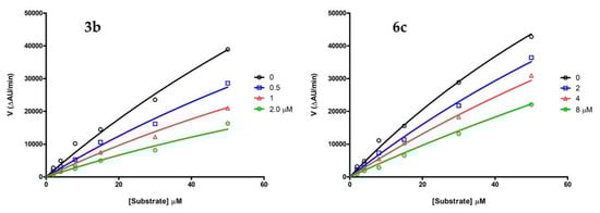 The investigation of the inhibition kinetics of 3b and 6c, taken as representative of the two subsets of MAO B-selective inhibitors, resulted in Michaelis-Menten curves’ fitting for competitive MAO B inhibition (Figure 5), with inhibition constant (Ki) values equal to 1.41 ± 0.21 μM and 6.47 ± 0.22 μM, respectively.