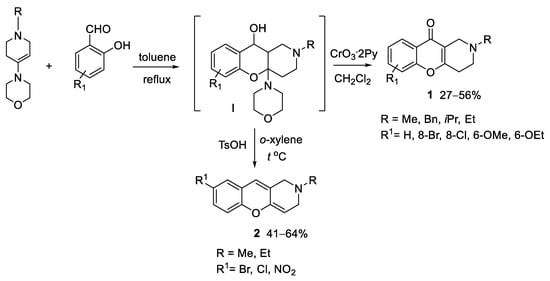 1,2,3,4-tetrahydrochromeno[3,2-c]pyridin-10-one (1) and 2,3-dihydrochromeno[3,2-c]pyridines (2), whose scaffold will be henceforth referred as THCP and DHCP, respectively, were synthesized through a three-stage synthesis. The synthesis of the THCP-10-one derivatives 1 was described earlier [,,]. The synthesis of the DHCPs 2 was carried out through condensation of morpholine with N-methylpiperidone followed by cyclization of the resulting enamine with substituted salicylic aldehydes and boiling of the intermediate hexahydrochromeno[3,2-c]pyridine in o-xylene (Scheme 1).