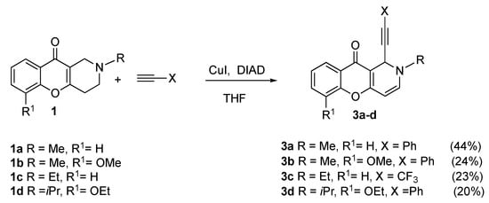 In this study, the introduction of X-substituted ethinyl fragments onto the tetrahydropyridine cycle expanded the synthetic and biological capabilities of the chromenopyridines. 1,2-Dihydrochromeno[3,2-c]pyridin-10-one (DHCP-10-one) derivatives 3a–d were obtained by a cross-coupling reaction of 1a–d with terminal alkynes in the presence of CuI and diisopropylazadicarboxylate (DIAD) (Scheme 2).