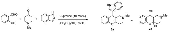 The interaction of salicylic aldehyde, 4-methylpiperidine and 1H-indole was performed in EtOH under heating in the presence of 10 mol% l-proline. However, instead of the expected product 6, hemiacetal 7 was obtained as a white crystalline substance (Scheme 6). We tried to optimize the reaction conditions by varying solvents, temperatures and catalysts (Table 1). The expected product 6 was obtained in just 12% yield only in CF3CH2OH as the solvent.