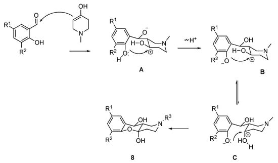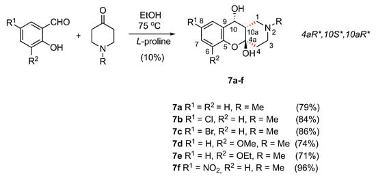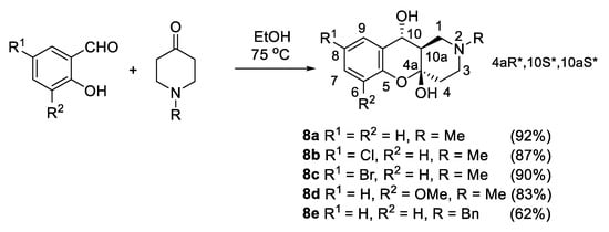 To confirm the role of l-proline in the stereoselective formation of 7, we performed reactions of salicylic aldehydes with 4-methylpiperidone without its addition. As a result, a series of compounds 8a–e was obtained with almost the same yields as for reactions in the presence of proline (Scheme 9).