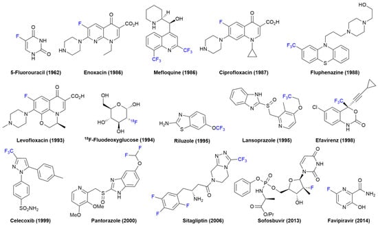 Structures of representative fluorinated heterocyclic drugs approved by FDA, with the year of approval in brackets.