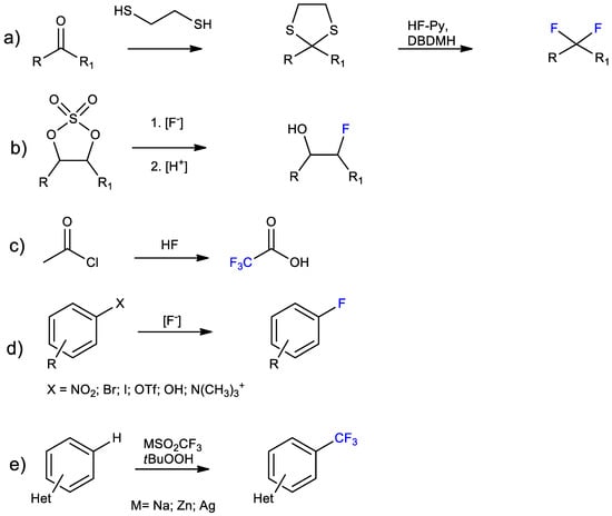 Representative reaction schemes for introduction of F atoms into organic molecules. Introduction of (a) two, (b) one or (c) three fluorine atoms into alkyl chains. Introduction of (d) one fluorine or (e) trifluoromethyl into aromatics.