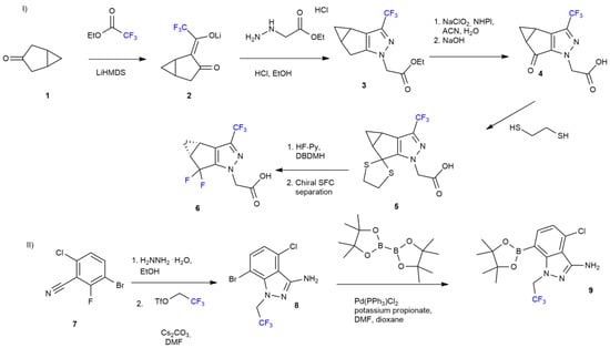 Synthesis of Lenacapavir, part (I–II). (I) Synthesis of intermediate 6; (II) Synthesis of intermediate 9.