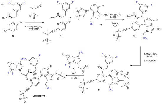 The synthetic method to obtain Lenacapavir is divided into three steps and is reported in Scheme 1 and Scheme 2 [].