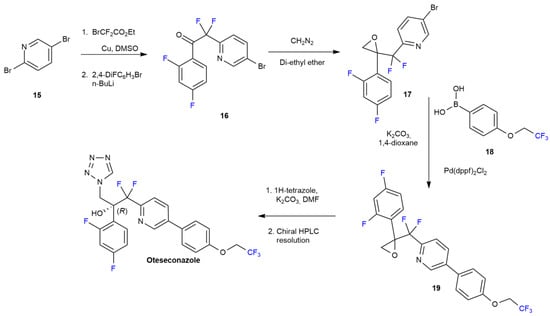 Starting with pyridine 15, ethyl bromodifluoroacetate and 2,4-difluorobromobenzene are used to introduce the CF2 linker and 2,4-difluorobenzene group, respectively, producing 16. Through a diazomethane-mediated epoxidation reaction, intermediate 17 is obtained and reacts with 4-(trifluoromethoxy)phenylboronic acid 18 via a Pd catalyzed Suzuky–Miyaura coupling reaction, producing 19. In the next two steps, the introduction of the triazole ring occurs via nucleophilic attack, leading to the opening of the epoxy ring. Oteseconazole is finally achieved as a single enantiomer by chiral preparative HPLC.