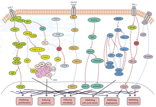 In recent years, a lot of literature has been reported about the classical anti-tumor signaling pathways of natural products, which are found to have the advantages of multiple targets and pathways, providing a sufficient theoretical basis for natural products as more promising antitumor drugs. For instance, the phosphoinositide 3-kinase (PI3K) signaling pathway is a crucial signaling pathway for normal cell physiological metabolism. By inhibiting this signaling pathway, tumor growth and metastasis can be prevented. Activation of PI3K can also assist in the phosphorylation of Akt and, ultimately, together play a crucial role in tumor progression [21]. For instance, Yan et al. [22] found that baicalein induced apoptosis and autophagy in breast cancer cells by inhibiting PI3K/Akt signaling pathway. In addition to the PI3K signaling pathway, the signal transducer and activator of the transcription 3 (STAT3) signaling pathway is one of the key targets for cancer therapy, which is a significant intracellular signal transduction protein and transcription factor directly related to the growth of tumors [23]. Luo et al. [24] found that Bavachin induces iron death in osteosarcoma cells via inhibition of STAT3 activity. Additionally, mitogen-activated protein kinase (MAPK) is a crucial intracellular signal transduction system that controls a variety of processes in cells, including cell growth, proliferation, differentiation, apoptosis, adhesion, and migration. These processes have an impact on drug resistance, invasion, and metastasis, as well as tumorigenesis, making it one of the potential targets of anti-tumor medications [25].