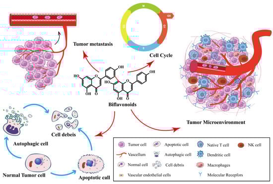 At first, cancer was thought to be a genetic or cellular expression disorder, and it was also thought to result from the disturbance of the tumor microenvironment (TME) [141]. ECM, stromal cells, immune cells, and other secreted molecules like growth factors, cytokines, and blood and lymphatic vascular networks coordinate with each other to regulate TME [142,143]. Emerging evidence suggests that SFB regulated the TME primarily by mediating inflammatory responses and immunosuppression [144]. Cheng et al. [145] found that ginkgetin regulated the tumor-associated microenvironment by suppressing the inflammatory response. In HeLa cells, ginkgetin reduced the expression of pro-inflammatory molecules, such as TNF-α, IL-1β, and IL-8 [146]. According to this study, ginkgetin treatment of HeLa cells for 48 h significantly decreased the expression levels of TNF-α, IL-1β, and IL-8 mRNA in a dose-dependent manner. It also significantly decreased the levels of phosphorylation of p38 and NF-κB, which had an anti-proliferative effect on HeLa cells. In addition to being a major exogenous mediator of apoptosis, TNF-α is a cytokine produced mainly by activated macrophages. TNF-α may have pro-apoptotic or anti-apoptotic effects depending on the cellular context [147]. Furthermore, the protective effect of amentoflavone on myocardial ischemia-reperfusion injury in vitro and in vivo through inhibition of apoptosis and inflammation demonstrated that the protective effect of amentoflavone on ischemia-reperfusion injury might be related to the decreased release of proinflammatory factors and the inhibition of the inflammatory response [148]. Amentoflavone also exerts an anti-endotoxin-induced inflammatory effect on BV2 microglia through inhibition of the TLR4/MyD88/NF-κB pathways and activation of the Nrf2/HO-1 pathway [149]. Similarly, Li et al. [150] found that delicaflavone reactivated anti-tumor effects by eliminating monocyte myeloid cell-mediated immunosuppression. Wang et al. [151] demonstrated that delicaflavone inhibited the growth of lung cancer cells by suppressing Mettl3/Mettl14 in order to activate anti-tumor immunity.