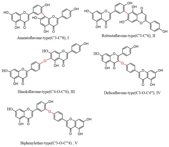 Biflavonoids, a unique class of flavonoids, are primarily soluble in ethyl acetate. Their basic structural unit is made up of two molecules of flavonoids, generally in accordance with a C–C or C–O–C link. Currently, 71 different types of biflavonoids have been discovered in Selaginella plants [34]. They can be divided into five categories based on the various connection methods. As shown in Figure 3: ① amentoflavone-type (C′3-C″8)(I), of which there are 24 species, mainly represented by amentoflavone and isoginkgetin; ② robustaflavone-type (C′3-C″6)(II), with 23 species, mainly represented by robustaflavone; ③ hinokiflavone-t (C′4-O-C″6)(III), with ten species, mainly represented by hinokiflavone and isocryptomerin; ④ delicaflavone-type (C3-O-C4‴)(IV), of which there are four species, mainly represented by delicaflavone; and ⑤ biphenylether-type (C′3-O-C‴4)(V), of which there are two species.
