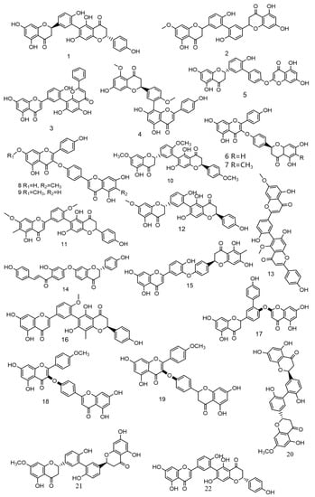 Over the past 5 years, scientists have discovered numerous novel biflavonoids in Selaginella plants [35]. Nine species of bioflavonoids from Selaginella doederleinii have been recently discovered [29,30,31]. As shown in Figure 4. Among these, compound 2 [36] showed modest selectivity to A549 cells and MCF-7 cells; compound 4 [37] demonstrated potent cytotoxicity against the human cancer cell lines SMMC-7721, A549, and MCF-7; and compounds 6–9 [38] considerably inhibited the proliferation of non-small cell lung cancer. The most active compound, 9, caused apoptosis and cycle arrest in A549 cells. A new robustaflavone, (2S, 2′S)-2,3,2′,3′-tetrahydrorobustaflavone 7,4′,4‴-trimethyl ether (10), was isolated from a 75% ethanolic aqueous extract of Selaginella uncinate [39]. Selaginella trichoclada was extracted with 70% ethanol, and five novel biflavonoids were discovered. Among them, compounds 11 and 12 [40] demonstrated moderate cytotoxicity to human cancer cell lines A549 and HepG2; compound 13 [41] was effective against breast cancer via the mitochondrial pathway; compound 14 [42] demonstrated moderate cytotoxicity to human cancer cell lines DU145, MCF-7, and PC3; and compound 15 [43] showed cytotoxicity to the human breast cancer cell line MCF-7. A new biflavonoid (16) was isolated from a 70% ethanolic extract of Selaginella braunii, which showed significant antiproliferative effects on SMMC-7721, MCF-7, and A549 cells [44]. From Selaginella siamensis and Selaginella bryopteris, three novel biflavonoids known as siamamenflavones A–C (17–19) were isolated. One of them, siamamenflavone B (18), exhibited potent inhibition of wild-type EGFR protein [45]. Selaginella tamariscina yielded three novel biflavonoids: involvenflavone G (20), H (21), and I (22); H and I may have potent hypoglycemic effects [46].